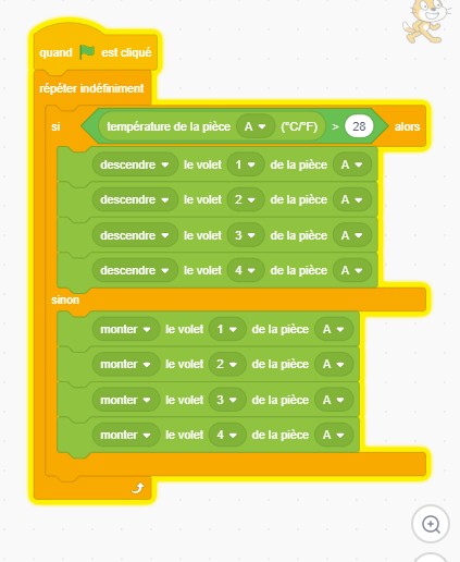 Créez un scénario domotique via Scratch pour fermer les volets automatiquement lorsque la température excède 28°C dans la maison.