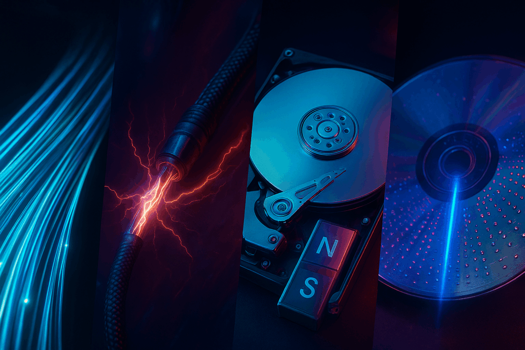 Bande magnétique (cassettes, bandes de sauvegarde) : magnétisme (comme le disque dur mais sur une bande flexible).
