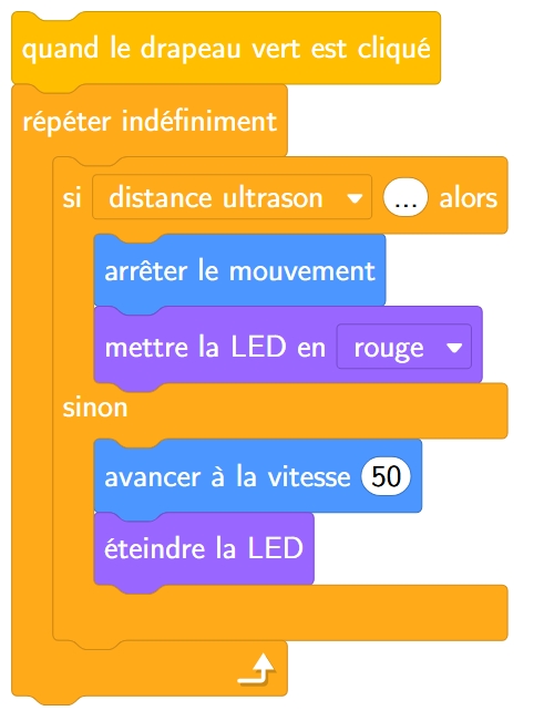Complète le programme ci-dessous pour que le mBot s’arrête et allume ses lumières s’il détecte un obstacle à moins de 15 cm.